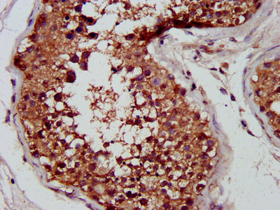 IHC image of CSB-PA873651LA01HU diluted at 1:400 and staining in paraffin-embedded human testis tissue performed on a Leica BondTM system. After dewaxing and hydration, antigen retrieval was mediated by high pressure in a citrate buffer (pH 6.0). Section was blocked with 10% normal goat serum 30min at RT. Then primary antibody (1% BSA) was incubated at 4°C overnight. The primary is detected by a biotinylated secondary antibody and visualized using an HRP conjugated SP system.