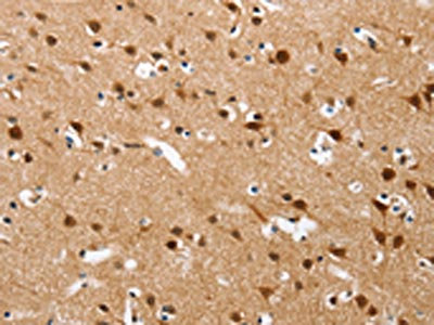 • The image on the left is immunohistochemistry of paraffin-embedded Human brain tissue using CSB-PA568771(CXCL14 Antibody) at dilution 1/60, on the right is treated with fusion protein. (Original magnification: ×200)
