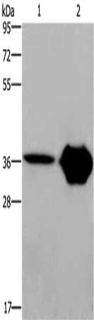 Gel: 8%SDS-PAGE, Lysate: 40 μg, Lane 1-2: Human fetal brain tissue, mouse brain tissue, Primary antibody: CSB-PA224134(CXCR6 Antibody) at dilution 1/350, Secondary antibody: Goat anti rabbit IgG at 1/8000 dilution, Exposure time: 2 minutes