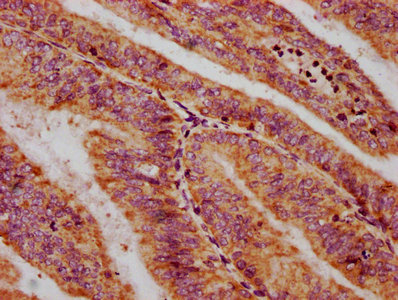 IHC image of CSB-PA887998LA01HU diluted at 1:400 and staining in paraffin-embedded human endometrial cancer performed on a Leica BondTM system. After dewaxing and hydration, antigen retrieval was mediated by high pressure in a citrate buffer (pH 6.0). Section was blocked with 10% normal goat serum 30min at RT. Then primary antibody (1% BSA) was incubated at 4°C overnight. The primary is detected by a biotinylated secondary antibody and visualized using an HRP conjugated SP system.