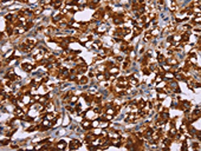 The image on the left is immunohistochemistry of paraffin-embedded Human thyroid cancer tissue using CSB-PA130250(CYP2W1 Antibody) at dilution 1/60, on the right is treated with fusion protein. (Original magnification: ×200)