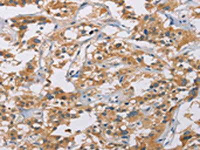 • The image on the left is immunohistochemistry of paraffin-embedded Human thyroid cancer tissue using CSB-PA913264(CYP4A11 Antibody) at dilution 1/25, on the right is treated with fusion protein. (Original magnification: ×200)