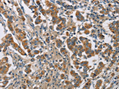 • The image on the left is immunohistochemistry of paraffin-embedded Human breast cancer tissue using CSB-PA913264(CYP4A11 Antibody) at dilution 1/25, on the right is treated with fusion protein. (Original magnification: ×200)