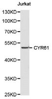 • Western blot analysis of Jurkat cell lysate using CYR61 antibody.