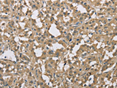 The image on the left is immunohistochemistry of paraffin-embedded Human thyroid cancer tissue using CSB-PA177824(DACH2 Antibody) at dilution 1/40, on the right is treated with fusion protein. (Original magnification: ×200)