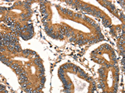 The image on the left is immunohistochemistry of paraffin-embedded Human colon cancer tissue using CSB-PA262326(DAP Antibody) at dilution 1/40, on the right is treated with synthetic peptide. (Original magnification: ×200)