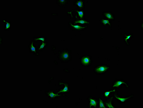 Immunofluorescence staining of A549 cells with CSB-PA892478LA01HU at 1:100, counter-stained with DAPI. The cells were fixed in 4% formaldehyde and blocked in 10% normal Goat Serum. The cells were then incubated with the antibody overnight at 4°C. The secondary antibody was Alexa Fluor 488-congugated AffiniPure Goat Anti-Rabbit IgG(H+L).