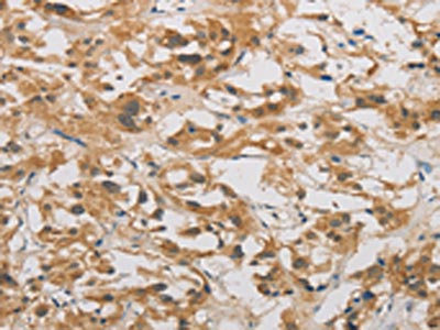 • The image on the left is immunohistochemistry of paraffin-embedded Human thyroid cancer tissue using CSB-PA794556(DDIT4 Antibody) at dilution 1/20, on the right is treated with fusion protein. (Original magnification: ×200)