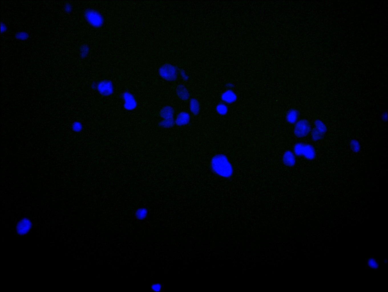 Immunofluorescence staining of Hela cell with 5% goat serum, counter-stained with DAPI. The cells were fixed in 4% formaldehyde and blocked in 10% normal Goat Serum. The cells were then incubated with the antibody overnight at 4C. The secondary antibody was Alexa Fluor 488-congugated AffiniPure Goat Anti-Rabbit IgG(H+L).