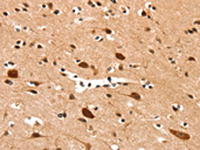The image on the left is immunohistochemistry of paraffin-embedded Human brain tissue using CSB-PA572968(DDX4 Antibody) at dilution 1/25, on the right is treated with synthetic peptide. (Original magnification: ×200)