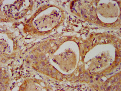 IHC image of CSB-PA621761LA01HU diluted at 1:500 and staining in paraffin-embedded human cervical cancer performed on a Leica BondTM system. After dewaxing and hydration, antigen retrieval was mediated by high pressure in a citrate buffer (pH 6.0). Section was blocked with 10% normal goat serum 30min at RT. Then primary antibody (1% BSA) was incubated at 4°C overnight. The primary is detected by a biotinylated secondary antibody and visualized using an HRP conjugated SP system.
