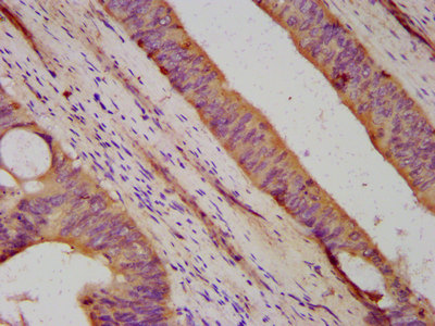 IHC image of CSB-PA621761LA01HU diluted at 1:500 and staining in paraffin-embedded human colon cancer performed on a Leica BondTM system. After dewaxing and hydration, antigen retrieval was mediated by high pressure in a citrate buffer (pH 6.0). Section was blocked with 10% normal goat serum 30min at RT. Then primary antibody (1% BSA) was incubated at 4°C overnight. The primary is detected by a biotinylated secondary antibody and visualized using an HRP conjugated SP system.