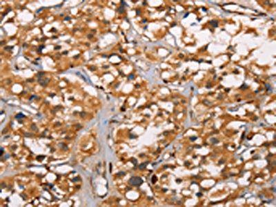 • The image on the left is immunohistochemistry of paraffin-embedded Human thyroid cancer tissue using CSB-PA556009(DICER1 Antibody) at dilution 1/40, on the right is treated with synthetic peptide. (Original magnification: ×200)