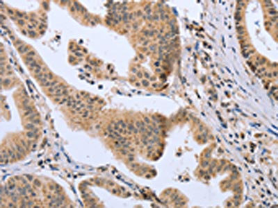 • The image on the left is immunohistochemistry of paraffin-embedded Human gastic cancer tissue using CSB-PA783949(DLD Antibody) at dilution 1/20, on the right is treated with fusion protein. (Original magnification: ×200)