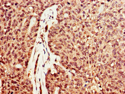 IHC image of CSB-PA007049LA01HU diluted at 1:600 and staining in paraffin-embedded human ovarian cancer performed on a Leica BondTM system. After dewaxing and hydration, antigen retrieval was mediated by high pressure in a citrate buffer (pH 6.0). Section was blocked with 10% normal goat serum 30min at RT. Then primary antibody (1% BSA) was incubated at 4°C overnight. The primary is detected by a biotinylated secondary antibody and visualized using an HRP conjugated SP system.