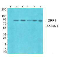 • Western blot analysis of extracts from HuvEc cells (Lane 2), HepG2 cells (Lane 3), colo cells (Lane 4), 293 cells (Lane 5) and JK cells (Lane 6), using DRP1 (Ab-637) antiobdy. The lane on the left is treated with synthesized peptide.