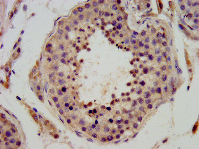 IHC image of CSB-PA744290LA01HU diluted at 1:400 and staining in paraffin-embedded human testis tissue performed on a Leica BondTM system. After dewaxing and hydration, antigen retrieval was mediated by high pressure in a citrate buffer (pH 6.0). Section was blocked with 10% normal goat serum 30min at RT. Then primary antibody (1% BSA) was incubated at 4°C overnight. The primary is detected by a biotinylated secondary antibody and visualized using an HRP conjugated SP system.