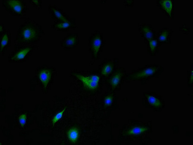 Immunofluorescent analysis of U87 cells using CSB-PA007182EA01HU at dilution of 1:100 and Alexa Fluor 488-congugated AffiniPure Goat Anti-Rabbit IgG(H+L)