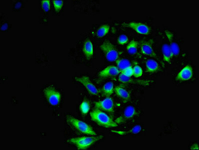 Immunofluorescent analysis of A549 cells using CSB-PA007182EA01HU at dilution of 1:100 and Alexa Fluor 488-congugated AffiniPure Goat Anti-Rabbit IgG(H+L)