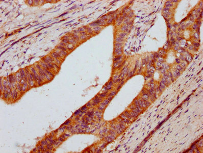 IHC image of CSB-PA734923HA01HU diluted at 1:400 and staining in paraffin-embedded human colon cancer performed on a Leica BondTM system. After dewaxing and hydration, antigen retrieval was mediated by high pressure in a citrate buffer (pH 6.0). Section was blocked with 10% normal goat serum 30min at RT. Then primary antibody (1% BSA) was incubated at 4°C overnight. The primary is detected by a biotinylated secondary antibody and visualized using an HRP conjugated SP system.