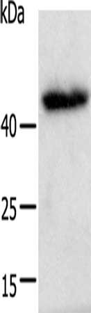 • Gel: 12+15%SDS-PAGE, Lysate: 40 μg, Lane: A549 cells, Primary antibody: CSB-PA103911(E2F2 Antibody) at dilution 1/600, Secondary antibody: Goat anti rabbit IgG at 1/8000 dilution, Exposure time: 10 minutes