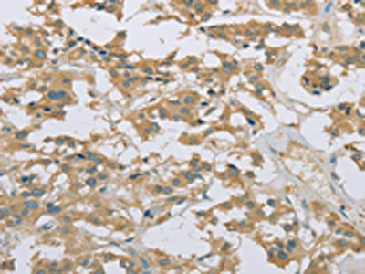 • The image on the left is immunohistochemistry of paraffin-embedded Human thyroid cancer tissue using CSB-PA994433(EEF2 Antibody) at dilution 1/20, on the right is treated with fusion protein. (Original magnification: ×200)