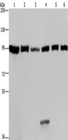 • Gel: 6%SDS-PAGE, Lysate: 40 μg, Lane 1-6: LoVo cells, HepG2 cells, NIH/3T3 cells, MCF7 cells, 293T cells, Hela cells, Primary antibody: CSB-PA994433(EEF2 Antibody) at dilution 1/200, Secondary antibody: Goat anti rabbit IgG at 1/8000 dilution, Exposure time: 20 seconds
