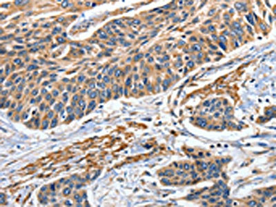The image on the left is immunohistochemistry of paraffin-embedded Human esophagus cancer tissue using CSB-PA035369(EFNB2 Antibody) at dilution 1/80, on the right is treated with fusion protein. (Original magnification: ×200)