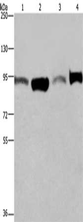• Gel: 6%SDS-PAGE, Lysate: 40 μg, Lane 1-4: A375 cells, LoVo cells, human testis tissue, Hela cells, Primary antibody: CSB-PA056223(ELAC2 Antibody) at dilution 1/250, Secondary antibody: Goat anti rabbit IgG at 1/8000 dilution, Exposure time: 30 seconds