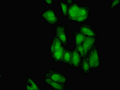 Immunofluorescent analysis of Hela cells using CSB-PA007593LA01HU at dilution of 1:100 and Alexa Fluor 488-congugated AffiniPure Goat Anti-Rabbit IgG(H+L)