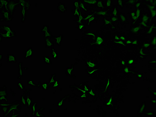 Immunofluorescence staining of SH-SY5Y cells with CSB-PA618015LA01HU at 1:100, counter-stained with DAPI. The cells were fixed in 4% formaldehyde and blocked in 10% normal Goat Serum. The cells were then incubated with the antibody overnight at 4°C. The secondary antibody was Alexa Fluor 488-congugated AffiniPure Goat Anti-Rabbit IgG(H+L).