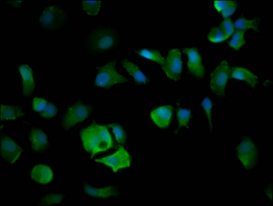 • Immunofluorescence staining of MCF-7 cells with CSB-PA853408LA01HU at 1:200, counter-stained with DAPI. The cells were fixed in 4% formaldehyde, permeabilized using 0.2% Triton X-100 and blocked in 10% normal Goat Serum. The cells were then incubated with the antibody overnight at 4°C. The secondary antibody was Alexa Fluor 488-congugated AffiniPure Goat Anti-Rabbit IgG(H+L).