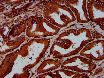 • IHC image of CSB-PA853408LA01HU diluted at 1:600 and staining in paraffin-embedded human prostate tissue performed on a Leica BondTM system. After dewaxing and hydration, antigen retrieval was mediated by high pressure in a citrate buffer (pH 6.0). Section was blocked with 10% normal goat serum 30min at RT. Then primary antibody (1% BSA) was incubated at 4°C overnight. The primary is detected by a biotinylated secondary antibody and visualized using an HRP conjugated SP system.