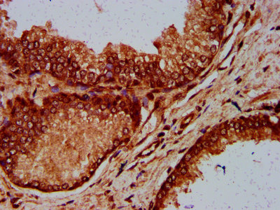 • IHC image of CSB-PA853408LA01HU diluted at 1:600 and staining in paraffin-embedded human prostate cancer performed on a Leica BondTM system. After dewaxing and hydration, antigen retrieval was mediated by high pressure in a citrate buffer (pH 6.0). Section was blocked with 10% normal goat serum 30min at RT. Then primary antibody (1% BSA) was incubated at 4°C overnight. The primary is detected by a biotinylated secondary antibody and visualized using an HRP conjugated SP system.