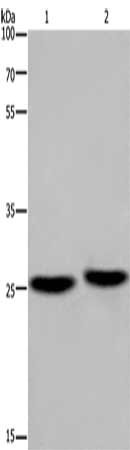 Gel: 8%SDS-PAGE, Lysate: 40 μg, Lane 1-2: Mouse brain tissue, human fetal muscle tissue, Primary antibody: CSB-PA010637(EPDR1 Antibody) at dilution 1/850, Secondary antibody: Goat anti rabbit IgG at 1/8000 dilution, Exposure time: 20 seconds