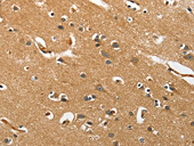 The image on the left is immunohistochemistry of paraffin-embedded Human brain tissue using CSB-PA637350(EPHB3 Antibody) at dilution 1/40, on the right is treated with synthetic peptide. (Original magnification: ×200)