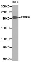 • Western blot analysis of extracts of HeLa cell line, using ERBB2 antibody.