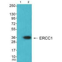 Western blot analysis of extracts from Hela cells (Lane 2), using ERCC1 antiobdy. The lane on the left is treated with synthesized peptide.