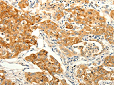 The image on the left is immunohistochemistry of paraffin-embedded Human gastic cancer tissue using CSB-PA903141(ERG Antibody) at dilution 1/30, on the right is treated with fusion protein. (Original magnification: ×200)