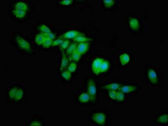 Immunofluorescence staining of HepG2 cells with CSB-PA857020EA01HU at 1:100, counter-stained with DAPI. The cells were fixed in 4% formaldehyde, permeabilized using 0.2% Triton X-100 and blocked in 10% normal Goat Serum. The cells were then incubated with the antibody overnight at 4°C. The secondary antibody was Alexa Fluor 488-congugated AffiniPure Goat Anti-Rabbit IgG(H+L).
