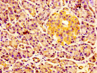 IHC image of CSB-PA857020EA01HU diluted at 1:100 and staining in paraffin-embedded human pancreatic tissue performed on a Leica BondTM system. After dewaxing and hydration, antigen retrieval was mediated by high pressure in a citrate buffer (pH 6.0). Section was blocked with 10% normal goat serum 30min at RT. Then primary antibody (1% BSA) was incubated at 4°C overnight. The primary is detected by a biotinylated secondary antibody and visualized using an HRP conjugated SP system.