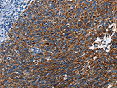 The image on the left is immunohistochemistry of paraffin-embedded Human cervical cancer tissue using CSB-PA703411(ETHE1 Antibody) at dilution 1/20, on the right is treated with fusion protein. (Original magnification: ×200)