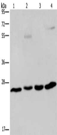 Gel: 10%SDS-PAGE, Lysate: 40 μg, Lane 1-4: A549 cells, human hepatocellular carcinoma tissue, mouse liver tissue, HT29 cells, Primary antibody: CSB-PA703411(ETHE1 Antibody) at dilution 1/400, Secondary antibody: Goat anti rabbit IgG at 1/8000 dilution, Exposure time: 1 minute