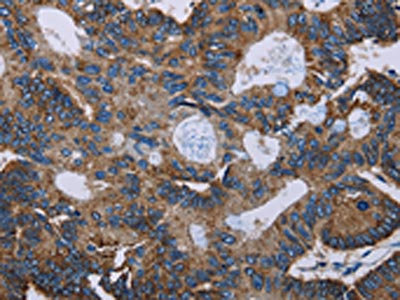 • The image on the left is immunohistochemistry of paraffin-embedded Human colon cancer tissue using CSB-PA869115(F11R Antibody) at dilution 1/60, on the right is treated with fusion protein. (Original magnification: ×200)