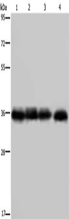 • Gel: 8%SDS-PAGE, Lysate: 40 μg, Lane 1-4: K562 cells, human kidney cancer tissue, 293T cells, HepG2 cells, Primary antibody: CSB-PA869115(F11R Antibody) at dilution 1/600, Secondary antibody: Goat anti rabbit IgG at 1/8000 dilution, Exposure time: 5 seconds