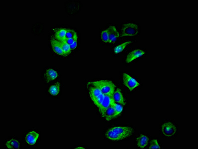 • Immunofluorescent analysis of MCF-7 cells using CSB-PA897579LA01HU at dilution of 1:100 and Alexa Fluor 488-congugated AffiniPure Goat Anti-Rabbit IgG(H+L)