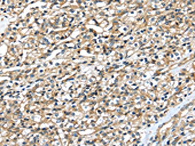 The image on the left is immunohistochemistry of paraffin-embedded Human prostate cancer tissue using CSB-PA877573(F2 Antibody) at dilution 1/35, on the right is treated with synthetic peptide. (Original magnification: ×200)