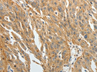 The image on the left is immunohistochemistry of paraffin-embedded Human ovarian cancer tissue using CSB-PA981490(F3 Antibody) at dilution 1/20, on the right is treated with fusion protein. (Original magnification: ×200)