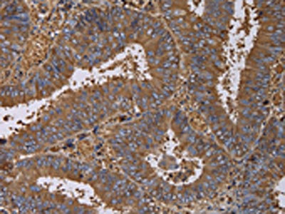 The image on the left is immunohistochemistry of paraffin-embedded Human colon cancer tissue using CSB-PA607012(FADS1 Antibody) at dilution 1/60, on the right is treated with fusion protein. (Original magnification: ×200)