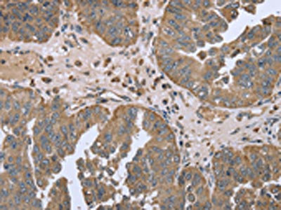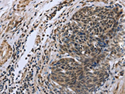 The image on the left is immunohistochemistry of paraffin-embedded Human cervical cancer tissue using CSB-PA098906(FANCG Antibody) at dilution 1/50, on the right is treated with fusion protein. (Original magnification: ×200)